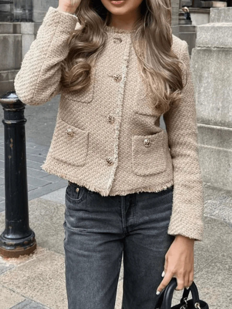 La veste IrĂšne incarne Ă merveille lâĂ©lĂ©gance et le raffinement đ. ConfectionnĂ©e en tweed de haute qualitĂ©, elle offre un style chic et intemporel, idĂ©al pour la saison automne-hiver đâïž.