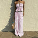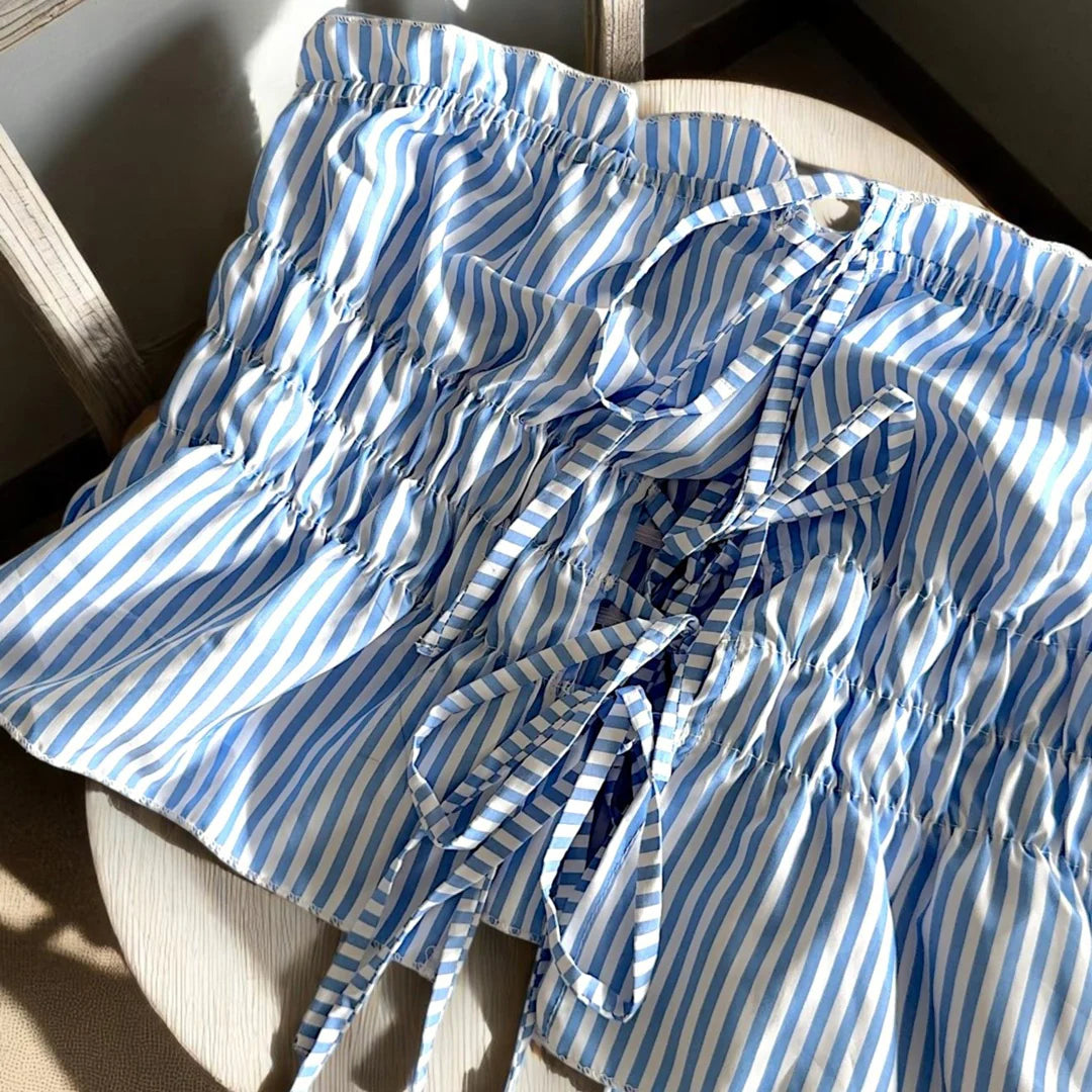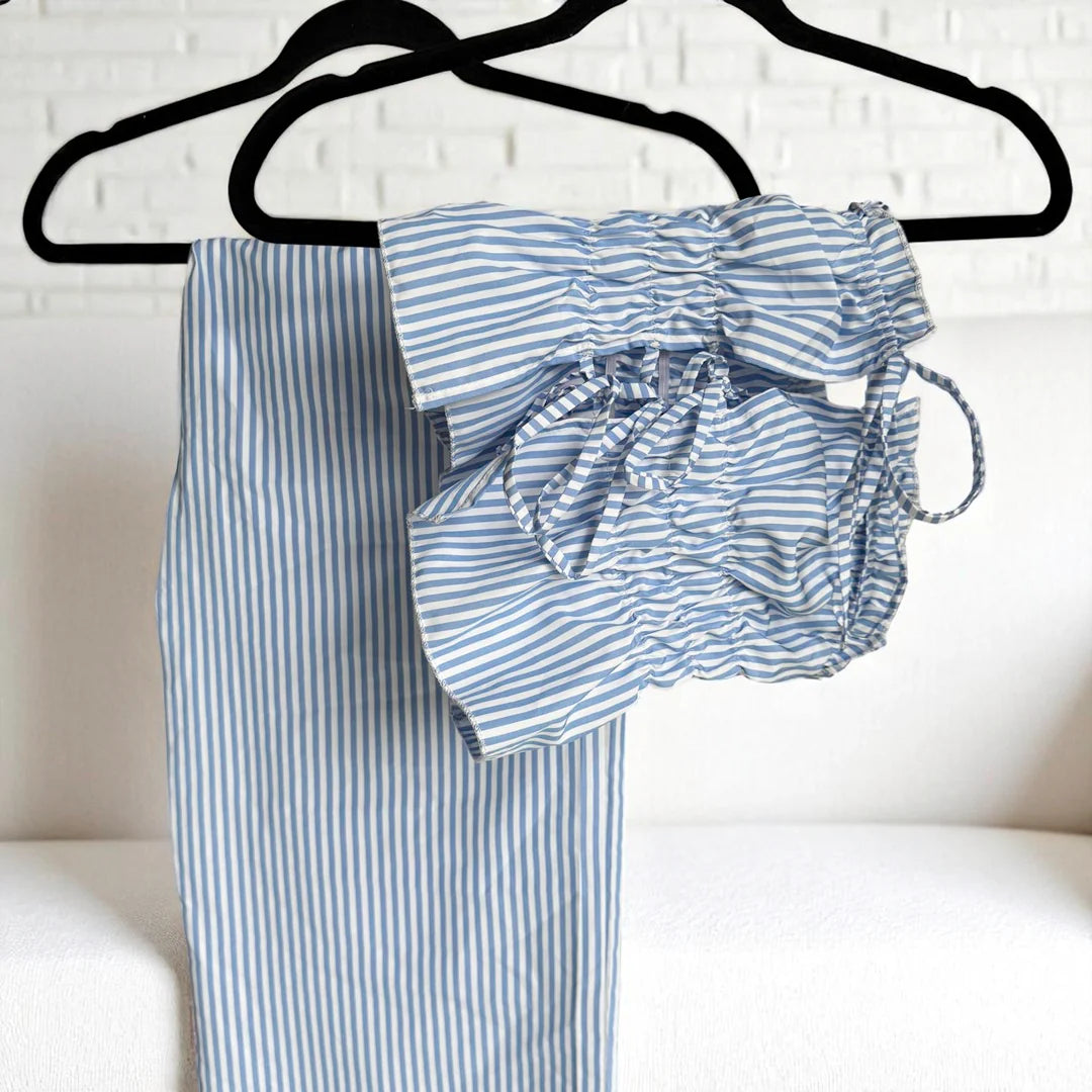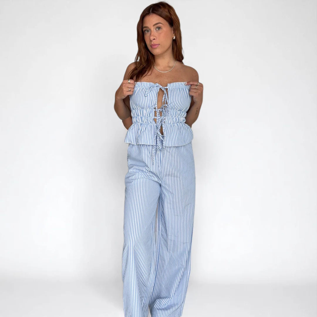L'ensemble haut tube et pantalon rayé Evie est la pièce incontournable pour un look décontracté et indéniablement élégant. Ce haut tube court présente une texture smockée pour une coupe flatteuse, tandis que les liens réglables sur le devant vous permettent de personnaliser facilement votre silhouette. Avec son motif rayé épuré et son haut sans bretelles, cet ensemble offre une esthétique soignée qui s'adapte parfaitement aux sorties du week-end comme aux balades ensoleillées.
