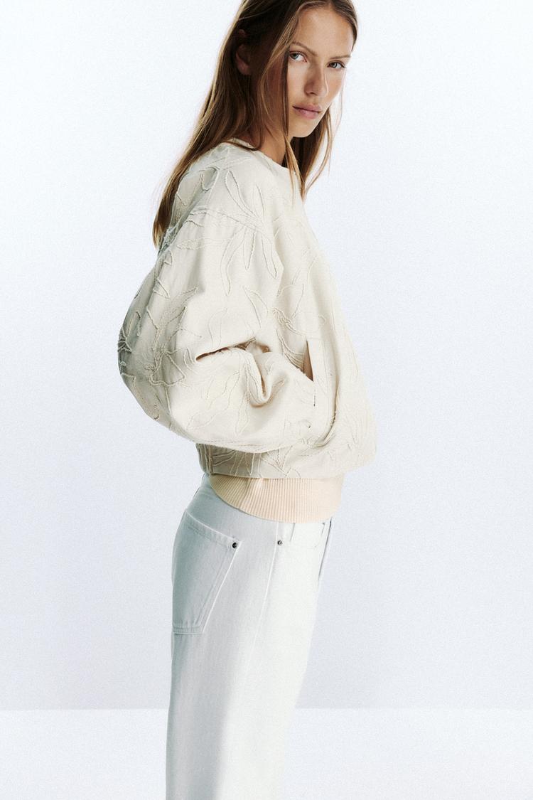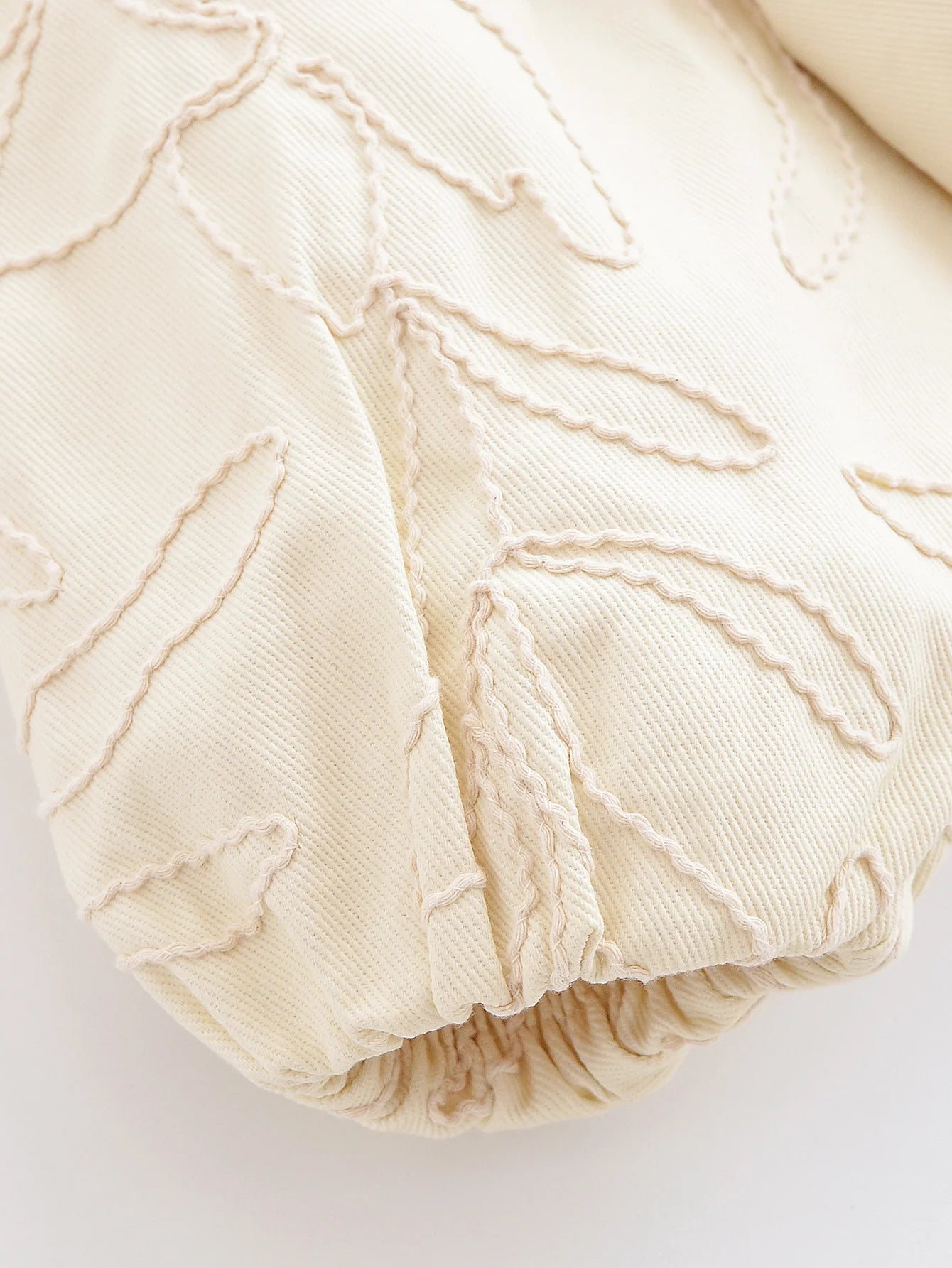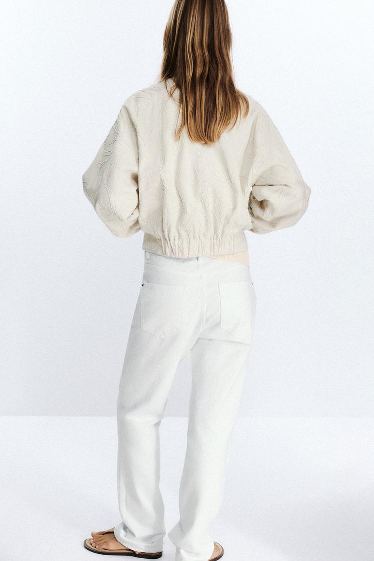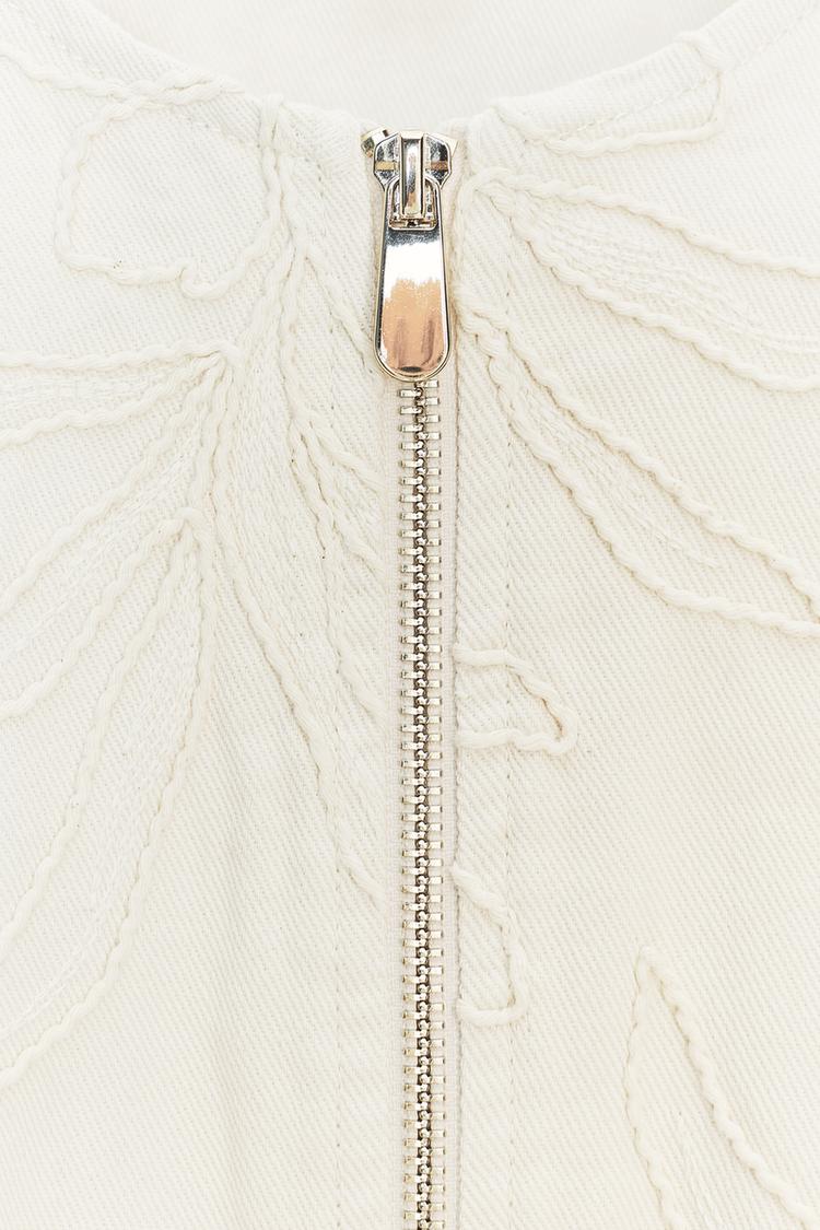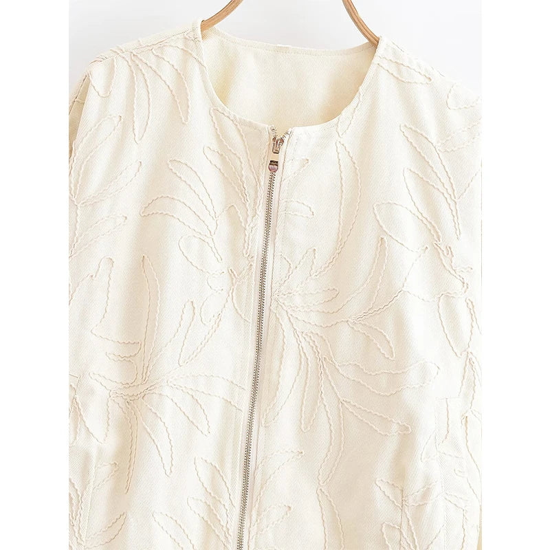 Veste à col rond et manches longues avec poignets élastiqués. Broderie ton sur ton. Poches passepoilées devant. Fermeture zippée métallique.
