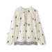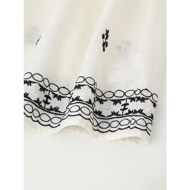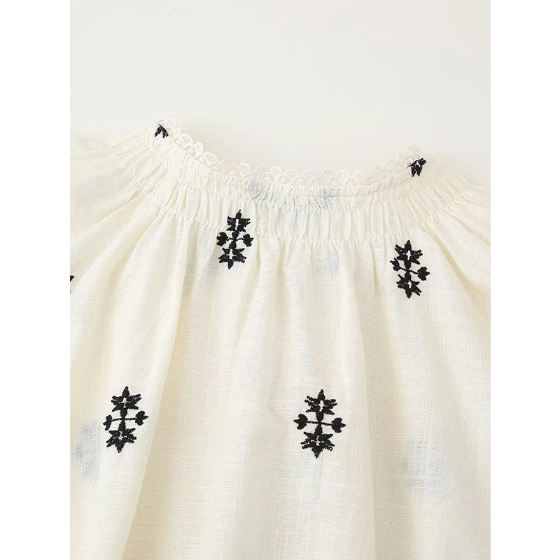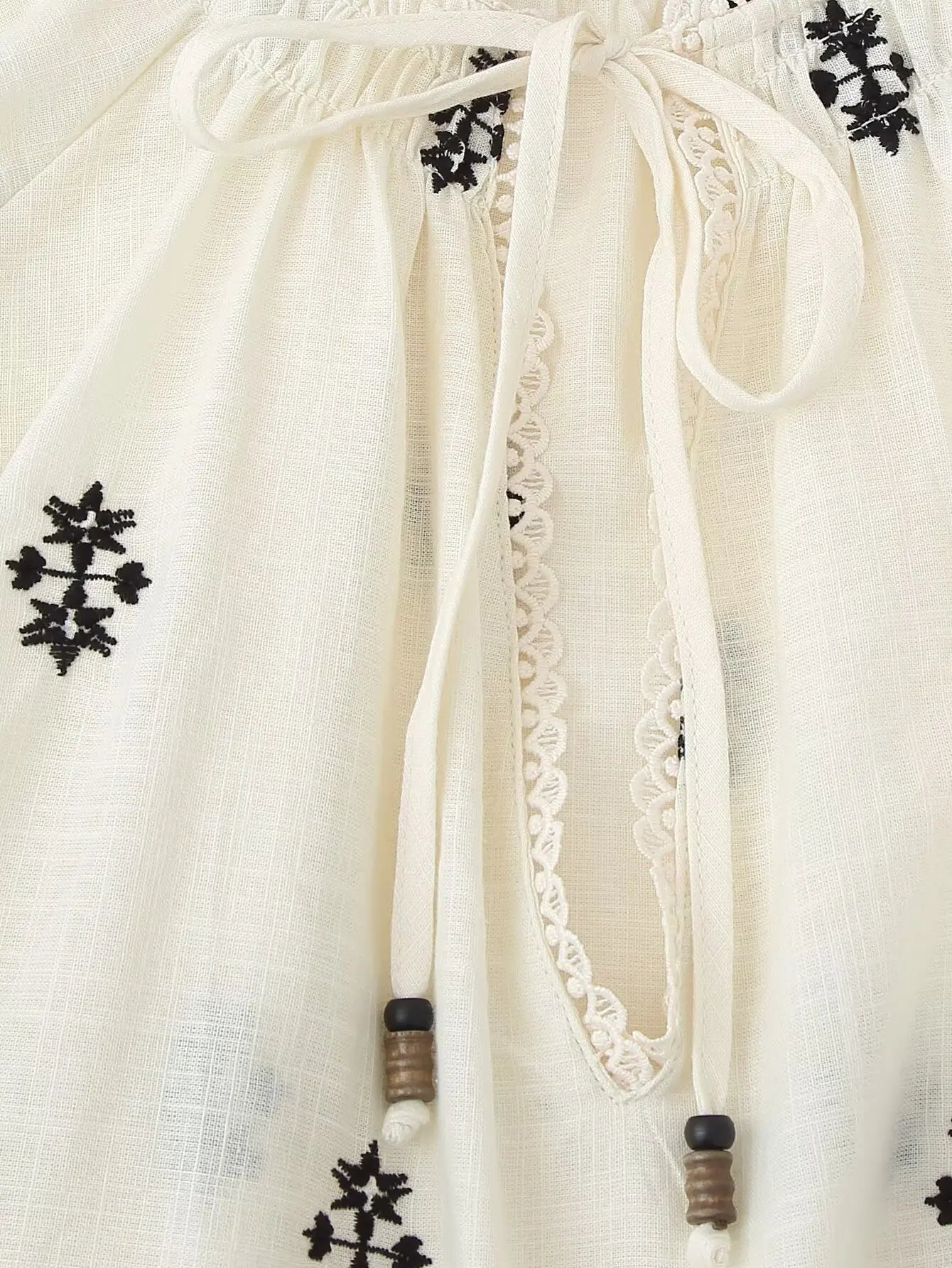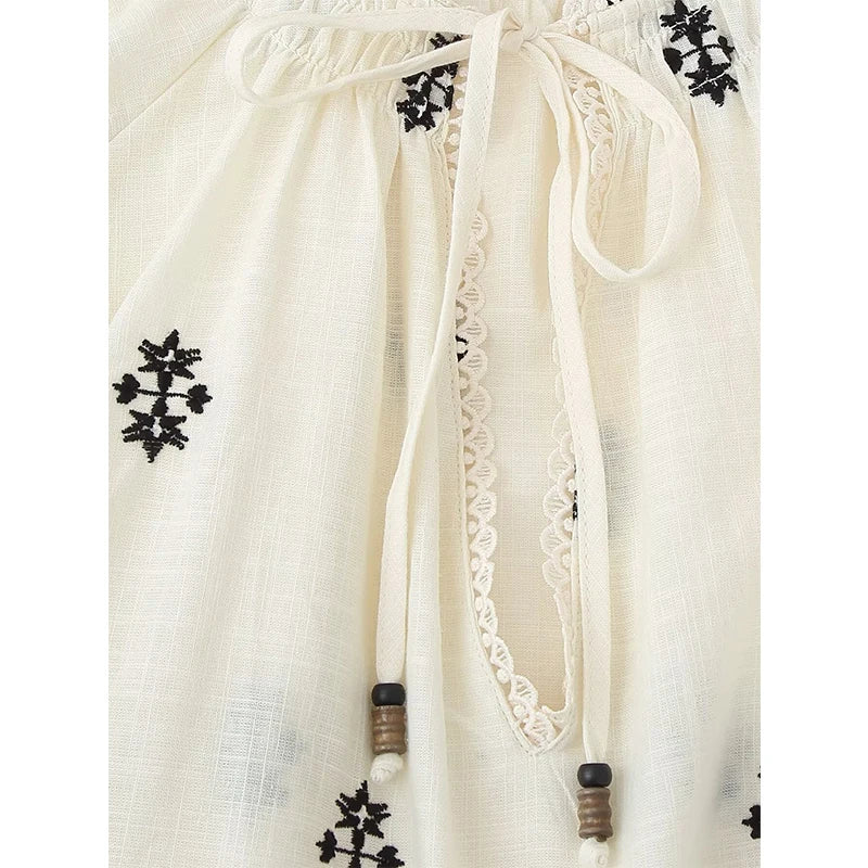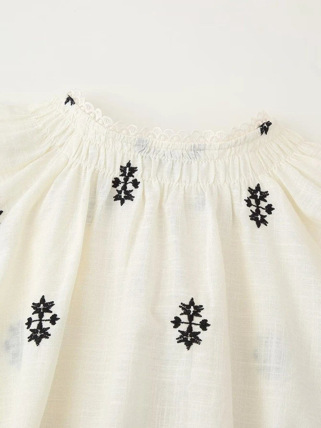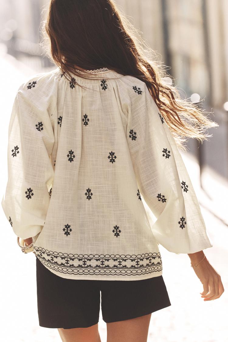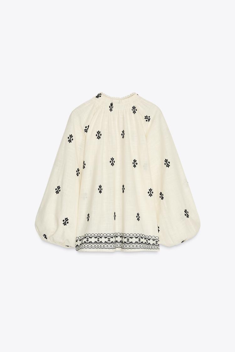 Chemisier à col rond avec bordure en dentelle, fronces et cordon de serrage. Col V et manches longues bouffantes. Broderies contrastantes.